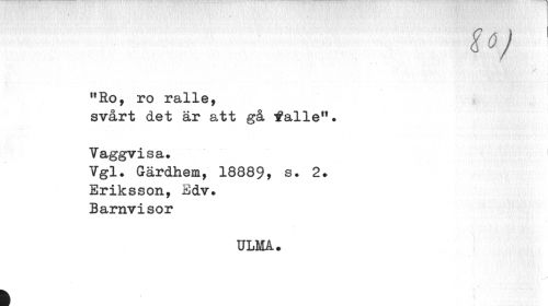//// U) ' //// : vi l y //// 11 Ro, ro ralle, //// svårt det är s,tt gå tfalle". //// Vaggvisa. //// Vgl. Gärdhem, 18889, s. 2. Eriksson, Bdv. Barnvisor //// ULMA» //// I ////