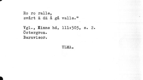 //// Ro ro ralle, //// svårt ä dä å gå valle." //// * ¦» //// Vgl., Kinne hd, 111:503, s. 2. //// Östergren. //// Barnvisor. //// ULMA. //// k ////