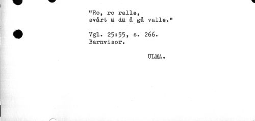 //// "Ro, ro ralle, //// svårt ä dä å gå valle." //// ^ Vgl. 25:55, S. 266. //// Barnvisor. //// ULMA. ////