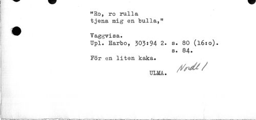 //// 11 Ro, ro rulla tjena mig en bulla,11 //// * ^H Hfe //// ^^ Vaggvisa. //// Upl. Harbo, 303:94 2. s. 80 (l6io). //// s • 84. //// För en liten kaka. //// //,-M / //// ULMA. ////