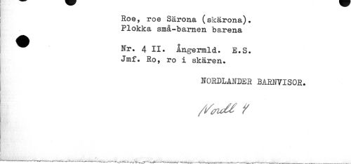 //// Roe, roe Särona (skärona). Plokka små-barneri barena //// ^ Nr. 4 II. Angermld. E.S. //// Jmf. Ro, ro i skären. //// NORDLANDER BARNVISOR. //// //outt Y //// / ////