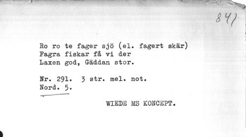 //// A //// &V //// \ //// j //// i //// i //// Ro ro te fager sjö (el. fagert skär) Fagra fiskar få vi der //// Laxen god, Gäddan stor. //// ... t //// Hr. 291» 3 str. mel. not. Nord. 5* //// WIEDE MS KONCEPT. //// 1 ////
