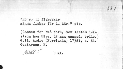 //// n~) //// i //// r //// i i //// MHo ro ti fiskeskär L //// många fiskar får du där.H etc. //// j //// (Lästes för små barn, men lästes Icke, såsom hos Säve, då man gungade bräde.) Gotl. Ardre (Norrlanda) 17381, s. 61. Gustavson, H. //// ULMA. //// i ////