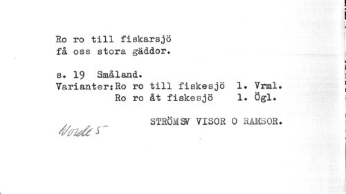 //// i I //// I //// Ro ro till fiskarsjö //// få oss stora gäddor. j //// ™ //// ¦ //// s. 19 Småland. \ //// VarianterjRo ro till fiskesjö 1. Vrml. j //// Ro ro åt fiskesjö 1. Ögl. //// STRÖM SV VISOR 0 RAMSOR. //// « j //// ! ////