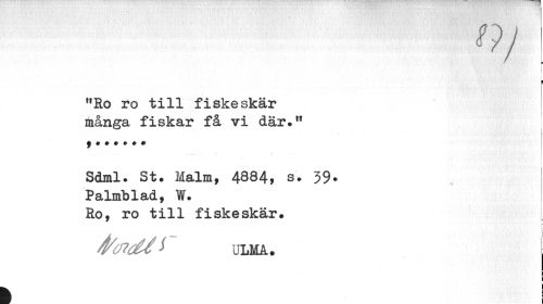 //// 0/ . //// I //// tfRo ro till fiskeskär många fiskar få vi där." //// Sdml. St. Malm, 4884, s. 39. //// Palmblad, W. //// Ro, ro till fiskeskär. //// l //// fadt / ~ ULM. : //// i i //// i ////