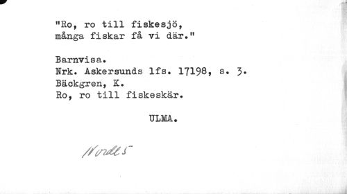 //// "Ro, ro till fiskesjö, många fiskar få vi där." //// Barnvisa. //// Nrk. Askersunds lfs. 1719B» 3* //// Bäckgren, K. //// Ro, ro till fiskeskär. //// ULMA. //// //{W&f ////