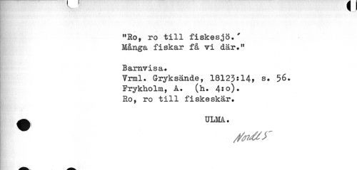 //// 1 I //// "Ro, ro till fiskesjö.' Många fiskar få vi där." //// Barnvisa. //// Vrml. Gryksände, 18123:14* s. 56. //// Frykholm, A. (h. 4*o). Ro, ro till fiskeskär. //// ^ ULMA. ////