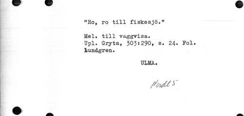 //// "Ro, ro till fiskesjö." Mel. till vaggvisa. //// Upl. Gryta, 303:290, s. 24. Pol. //// lund.gr en. //// ULMA. ////
