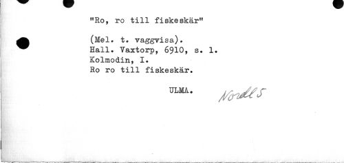 //// »Ro, ro till fiskeskär" //// ^fc (Mel. t. vaggvisa). //// ^^ Hall. Vaxtorp, 6910, s. 1. //// Kolmodin, I. Ro ro till fiskeskär. //// ULMA- /fa/fr ////
