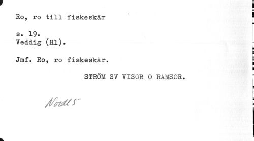 //// s= //// Ro, ro till fiskeskär f //// s. 19. //// Veddig (Hl). ¦ //// Jmf. Ro, ro fiskeskär. ! //// STRÖM SV VISOR 0 RAMSOR. //// 1 //// b //// /tfcvr \ //// V j ////