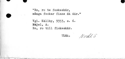 //// "Ro, ro te feskeskär, ^^ många fe skar finns dä där." //// Vgl. Källby, 9353, s. 6. //// Megel, A. //// Ro, ro till fiskeskär. //// ¦ //// njfliV * Y • ,v ////