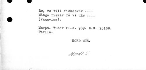 //// Ro, ro till fiskeskär ... Många fiskar få vi där ... (vaggvisa). //// Mskpt. Visor VI.s. 789. E.U. 26139. Pärila. //// NORD MUS. //// HSflraAy i- n „ A jr; 'i' //// UcOfljftK * : ////