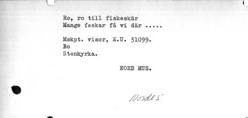 //// ; //// Ro, ro till fiskeskär Mange feskar få vi där //// Mskpt. visor, E.U. 31099. Bo //// Stenkyrka. //// NOHD MUS. //// /tfrk&S' ////