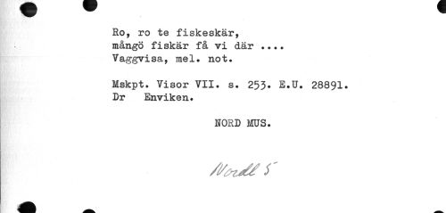 //// Ro, ro te fiskeskär, mångö fiskär få vi där Vaggvisa, mel. not. //// Mskpt. Visor VII. s. 253* E.U. 28891. Dr Enviken. //// NORD MUS. ////