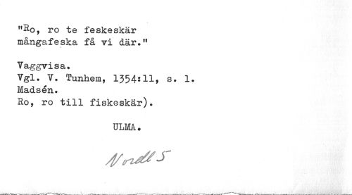 //// "Ro, ro te feskeskär mångafeska få vi där.11 //// Vaggvisa. //// Vgl. V. Tunhem, 1354:11, s. 1. Madsén. //// Ro, ro till fiskeskär). //// ULMA. //// /j1/trud* y //// ___fafc*__~___..._ _ Av _ . --- . ---w-»-*,.---"I"'--- J"---— ////