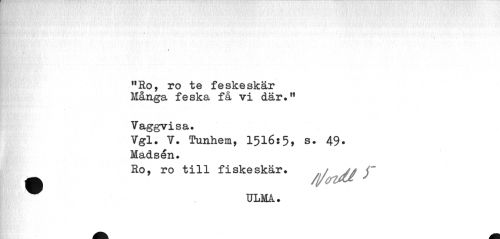//// / //// "Ro, ro te feskeskär Många feska få vi där." //// Vaggvisa. //// Vgl. V. Tunhem, 1516:5» s. 49 • Madsén. //// Ro, ro till fiskeskär. //// ULMA. ////