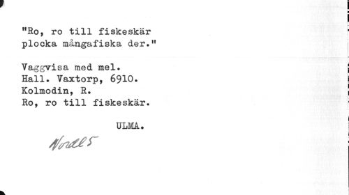 //// ¦ //// ! //// "Ro, ro till fiskeskär //// , i //// plocka mångafiska der." //// L i //// r //// Vaggvisa med mel. | //// Hall. Vaxtorp, 6910. i //// Kolmodin, R. j //// Ro, ro till fiskeskär. //// ULMA. | //// ¦ //// k ////