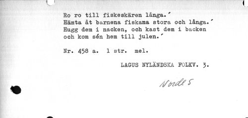 //// Ro ro till fiskeskären långa.' Hämta åt barnena fiskana stora och långa.' Hugg dem i nacken, och kast dem i backen och kom sen hem till julen.' //// \ //// Nr. 453 a. 1 str. mel. //// LAGUS UTLÄNDSKA FOLKV. 3. //// /tfrtdff ////