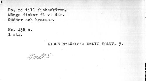 //// Ro, ro till fiskeskären, Många fiskar få vi där. Gäddor och braxnar. //// Nr. 458 c. 1 str. //// •i. i //// i //// LAGUS NYLANDSKA XKLSX FOLKY. 5. | //// < ////