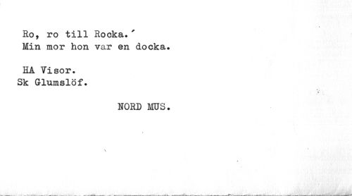 //// » //// Ro, ro till Rocka.' Min mor hon var en docka. //// HA Visor. Sk Glumslöf. //// 49 + //// NORD MUS. //// \ ////