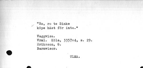 //// "Ro, ro te Sinke //// / //// köpe häst för inte." //// « //// Vaggvisa. //// Vrml. Kola, 3357:4, s. 29. //// Eriksson, G. //// Barnvisor. //// ULMA. ////