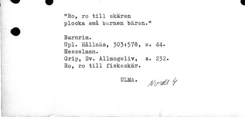 //// "Ro, ro till skären plocka små barnen bären." //// Barnrim. //// Upl. Hållnäs, 303:578, s. 44- //// Hesselman. //// Grip, Sv. Allmogeliv, s. 232. Ro, ro till fiskeskär. //// if. . •. s*"*"" ////