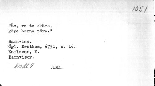 //// /ÖS/ I //// ¦ //// "Ro, ro te skära, köpe barna pära.n //// Barnvisa. //// Ögl. Drothem, 6751, s. 16. //// Karlsson, E. //// Barnvisor. //// ULMÅ. //// I ////
