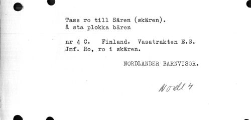 //// % //// Tass ro till Sären (skären), å sta plokka bären //// nr 4 C. Finland. Vasatrakten E.S. Jmf. Ro, ro i skären. //// NORDLANDER BARNVISOR. ////