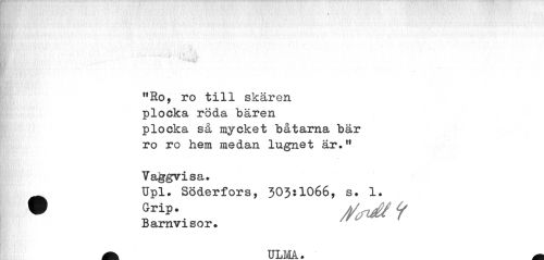 //// 11 Ro, ro till skären plocka röda bären plocka så mycket båtarna bär ro ro hem medan lugnet är." //// Vaggvisa. //// __Upl. Söderfors, 303:1066, s. 1. //// • Grip* //suM <f //// Barnvisor. //// a ULMA * _ ////