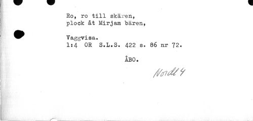 //// . //// Ro, ro till skären, plock åt Mirjam "bären, //// ^ Vaggvisa. //// 1:4 OR S.L.S. 422 s. 86 nr 72. //// ÅBO. //// f—"v ////