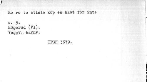 //// Ro ro te stinte köp en häst för inte //// r //// s. 3. | //// Högerud (Vi). Vaggv., barnv. //// IFGH 3679. //// I //// • 1 ////