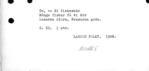 //// Ro, ro åt fiskeskär Många fiskar få vi där ^^ Laxarna stora, Braxarna goda. //// S. 62. 2 str. //// » //// lårson folkv. 1908. //// /!/aidtf ////