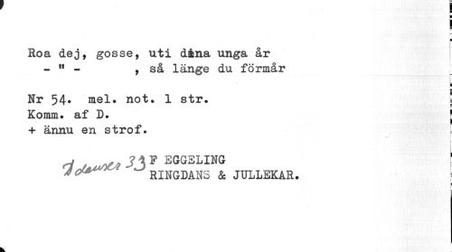 //// - //// r~ ¦ //// Roa dej, gosse, uti dåna unga år - 11 - , så länge du förmår //// [ //// Nr 54. mel. not. 1 str. I //// Komm. af D. j //// + ännu en strof. //// 1 //// d^to jj f ^geling i //// "p* ringdans & jullekar. //// 8 //// i ////