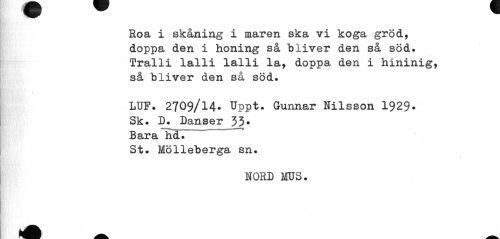 //// W ^^ //// Roa i skåning i maren ska vi koga gröd, doppa den i honing så bliver den så söd. Tralli lalli lalli la, doppa den i hininig, så bliver den så söd. //// « //// LUF. 2709/14. Uppt. Gunnar Nilsson 1929* Sk. D. Danser 33* Bara hd. //// St. Mölleberga sn. //// NORD MOS. ////