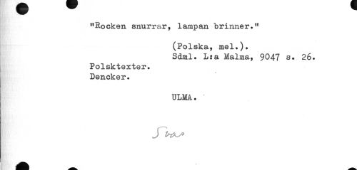 //// "Rocken snurrar, lampan brinner." //// (Polska, mel.). //// Sdml. L:a Malma, 9047 s. 26. //// Polsktexter. Dencker. //// ULMA. • //// J z^y ////