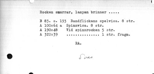 //// » //// Rocken snurrar, lampan brinner ... //// B 83* s. 193 Bandflickans spelvisa. 8 str. A 100:64 a Spinnvisa. 8 str. A 190:48 Vid spinnrocken 5 str. //// A 322:39 ... 1 str. fragm. //// RA. //// W J ////