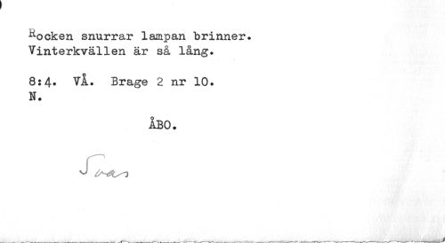 //// Rocken snurrar lampan brinner. Vinterkvällen är så lång. //// 8:4. VÅ. Brage 2 nr 10. N. //// ÅBO. //// r ////