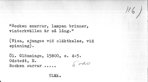 //// n ) //// ! //// "Rocken snurrar, lampan brinner, vinterkvällen är så lång." //// [ > //// (Visa, sjunges vid släktkalas, vid spinning). //// Öl. Glömminge, 15800, s. 4-5* Odstedt, E. //// Rocken surrar ...o //// ULMA. ////