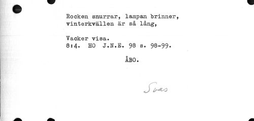 //// Rocken snurrar, lampan brinner, vinterkvällen är så lång, //// Vacker visa» //// 8:4* HO J.N.E. 98 s. 98-99» //// ÅBO. //// J ////