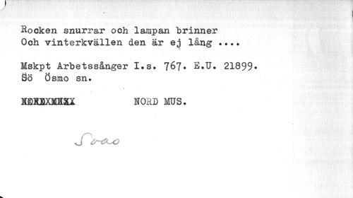 //// I //// Rocken snurrar och lampan "brinner //// Och vinterkvällen den är ej läng •.. • //// ¦ //// Mskpt Arbetssånger I.s. 767. E.U. 21899* Sö Ösmo sn. //// t //// XEKM1HXX NORD mus. ////