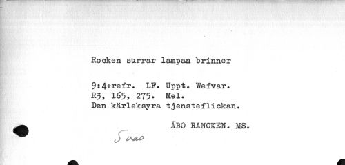 //// Rocken surrar lampan brinner 9:4+refr. LP. Uppt. WefVar. //// R3, 165, 275* Mel. //// Den kärleksyra tjensteflickan. ^ ÅBO RANCKE2J. MS. //// ^^ J ////
