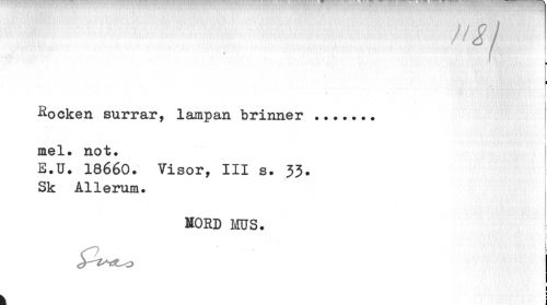 //// "SI //// i //// Socken surrar, lampan brinner ... //// I //// mel. not. //// E.U. 18660. Visor, III s. 33* Sk Allerum. //// HORD MUS. //// t i //// \ //// k I ////