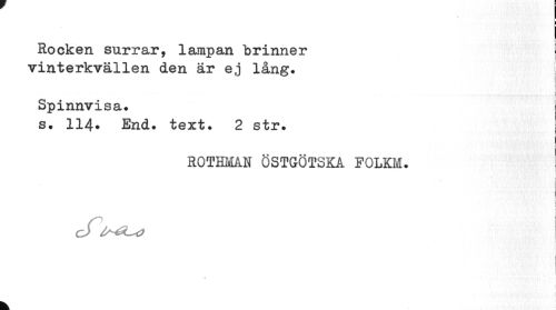 //// i //// Rocken surrar, lampan brinner vinterkvällen den är ej lång. //// ¦ //// Spinnvisa. //// s. 114* End. text. 2 str. //// I //// i //// ROTHMAN ÖSTGÖTSKA FOLKM. //// cf //// { //// 6 //// t ////