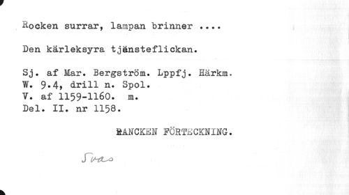 //// Rocken surrar, lampan brinner //// Den kärleksyra tjänsteflickan. //// Sj. af Mar. Bergström. Lppfj. Härkm. //// W. 9.4, drill n. Spol. V. af 1159-1160. m. Del. II. nr II58. //// SANCKEN FÖRTECKNING. //// k ////