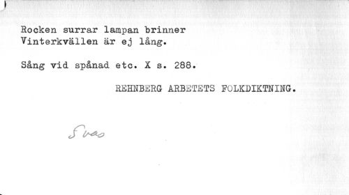 //// Rocken surrar lampan brinner Vinterkvällen är ej lång. //// Sång vid spånad etc. X s. 288. //// REHNBERG ARBETETS FOLKDIKTNING. ////