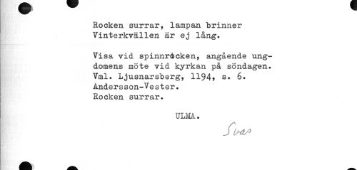 //// i n ^ //// Rocken surrar, lampan brinner Vinterkvällen är ej lång. //// Visa vid spinnråcken, angående ungdomens möte vid kyrkan på söndagen. Vml. Ljusnarsberg, 1194> s. 6. Andersson-Vester. Rocken surrar. //// ULMA. //// JU4S ////