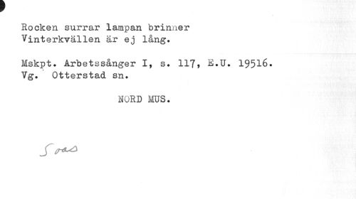 //// Rocken surrar lampan brinner Vinterkvällen är ej lång. //// Mskpt. Arbetssånger I, s. 117, E.U. 19516. Vg. Otterstad sn. //// NORD MUS. ////