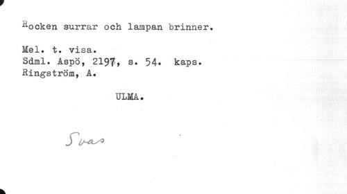 //// Rocken surrar och lampan brinner» Mel. t. visa. //// Sdml. Aspö, 2197-, s. 54* kaps. Ringström,. A. //// ULMA. //// JiHUL^ //// k. ////