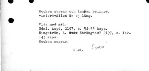 //// Rocken surrar och lampan brinner, vinterkvällen är ej lång. //// ^^ Visa med mel. //// Sdml. Aspö, 2197, s. 54-55 kaps. Ringström, A. Sbfcäx Strängnäs? 2197* s. 142- //// 143 kaps. Rocken surrar. //// ULMA. ////