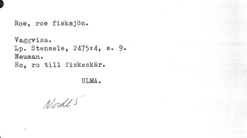 //// Roe, roe fisksjön. Vaggvisa. //// Lp. Stensele, 2475*4, s. 9* //// Neuman. //// Ro, ro till fiskeskär. //// ULMå. //// é ////